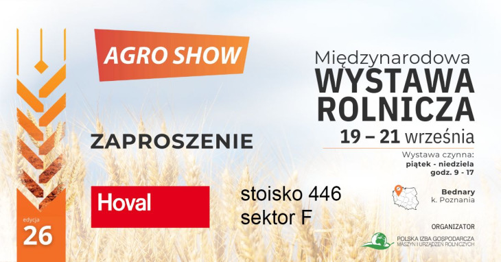 Spotkaj się z naszym zespołem na targach Agro Show, Miedzynarodowej Wystawie Rolniczej w Bednarach k. Poznania, w dniach 19-21 września 2025 roku. Hoval będzie czekał na swoich gości na stoisku nr 446 w sektorze F.