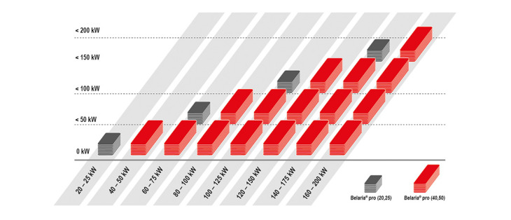Belaria pro z czterema stopniami mocy (20, 25, 40 i 50 kW) jest łatwa do kaskadowania, umożliwiając precyzyjną regulację mocy systemu w zakresie od 20 do 200 kW. Dzięki temu projektanci mają dostęp do odpowiedniego rozwiązania dla wszystkich wymagań w budownictwie mieszkaniowym i komercyjnym. Dzięki modulowanej technologii inwerterowej zawsze dostępna jest dokładnie taka moc, jaka jest aktualnie potrzebna. Rezultatem jest wydajna praca przy niskich kosztach eksploatacji.