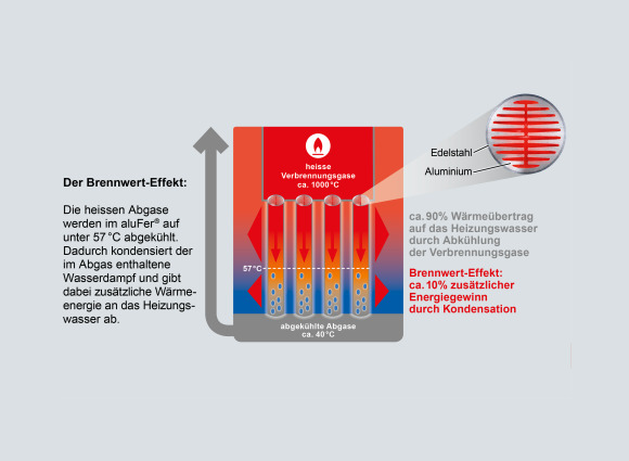 Technologia kondensacyjna to wydajna technologia, która może znacznie lepiej wykorzystać energię, oszczędzając w ten sposób zasoby i chroniąc środowisko. Technologia kondensacyjna wykorzystuje kluczowy element – kondensację: gaz grzewczy zawiera parę, która magazynuje duże ilości utajonej energii. Gdy para schłodzi się do temperatury poniżej 57°C, staje się cieczą (czyli skrapla się) i uwalnia tę energię. Dzięki technologii kondensacyjnej gaz grzewczy jest schładzany z 1000°C do zaledwie 40°C i przekazuje całą swoją energię cieplną do ogrzewania. W przypadku stosowania starszych kotłów gazowych o znacznie wyższych temperaturach spalin, wynoszących ok. 200°C, duża część energii cieplnej ucieka niewykorzystana przez komin. W porównaniu z tymi konwencjonalnymi kotłami niskotemperaturowymi, kocioł gazowy kondensacyjny osiąga dodatkowe zyski energetyczne sięgające nawet 20%.