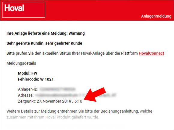 Die Zeitangaben der Anlagenmeldungen am Bedienmodul der Heizung (1) können abweichen von den Zeitangaben auf der HovalConnect Plattform (2) bzw. in der E-Mail oder Push-Benachrichtigung (3).